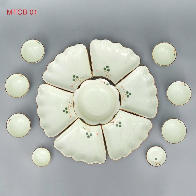 Trọn bộ bát đĩa hoa mặt trời men kem hoa sen xanh gốm sứ Bát Tràng có gì?