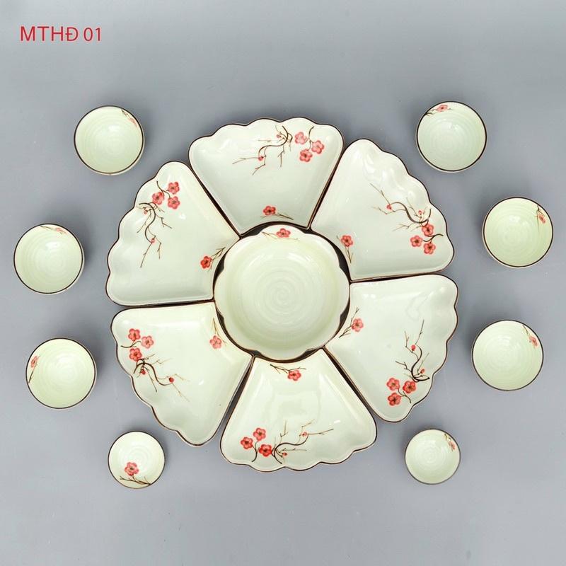 Thông tin sản phẩm: Chất liệu: Sứ Bát Tràng cao cấp Màu men kem, sáng, đẹp. Họa tiết: Hoa Đào đỏ, viền nâu. Bộ đồ ăn Bát Tràng được làm từ chất đất cao cấp,