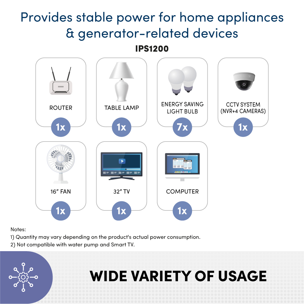 - IPS phù hợp cho các thiết bị gia đình như: Router, đèn, hệ thống an ninh, quạt điện, Tivi, hồ cá, máy tính, hệ thống âm thanh...