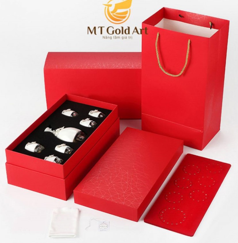 Bộ Bộ bình ly sứ pha lê đúc vàng lá 24k họa tiết hoa mai: bao gồm 1 bình và 6 ly. Đây là sản phẩm đặc biệt trong bộ sưu tập Pha Lê Sứ cao cấp. Sản phẩm không chỉ được tạo nên từ pha lê, gốm sứ cao cấp và vàng lá 24k.