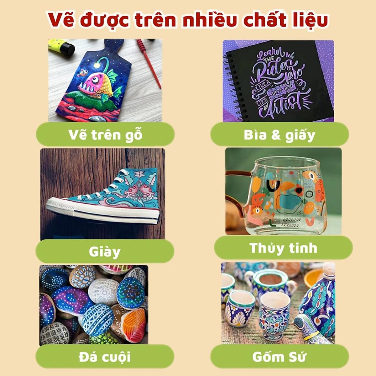 -Đa dụng: Bút Màu Acrylic Marker Cao Cấp - Bút Lông Màu có thể được sử dụng trên nhiều bề mặt khác nhau, bao gồm giấy, vải, gỗ, nhựa và kim loại. Điều này giúp bạn tự do khám phá và sáng tạo trên các loại chất liệu khác nhau. -Màu sắc phong phú: Sản phẩm đi kèm với 12/24/36/48/60 màu sắc đa dạng, cho phép bạn tạo ra các tác phẩm nghệ thuật đầy màu sắc và sinh động. Bạn có thể kết hợp các màu sắc để tạo ra các hiệu ứng độc đáo và sáng tạo.