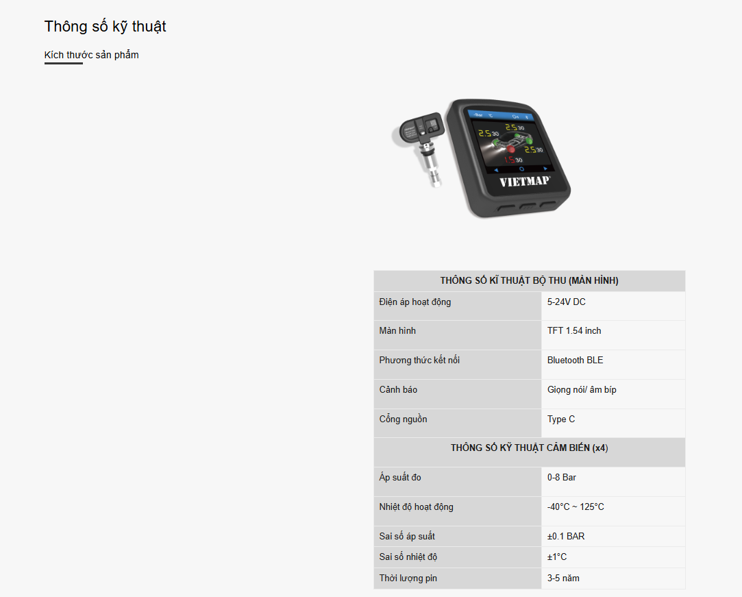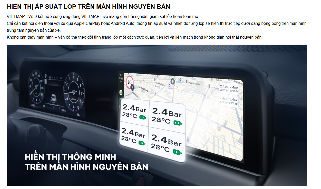 VIETMAP TW50 là bộ cảm biến áp suất lốp cao cấp dành cho ô tô, trang bị cả màn hình hiển thị riêng và khả năng kết nối với màn hình của xe thông qua