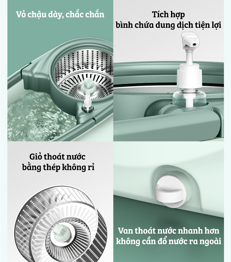 Bộ cây lau nhà xoay tay 360 độ MOP- L003 Màu sắc: Xanh lá cây Chất liệu : Nhựa, inox, sợi bông Kích thước: 49,5 x 31,5 x 30 (cm) -Lồng vắt bằng inox. Độ