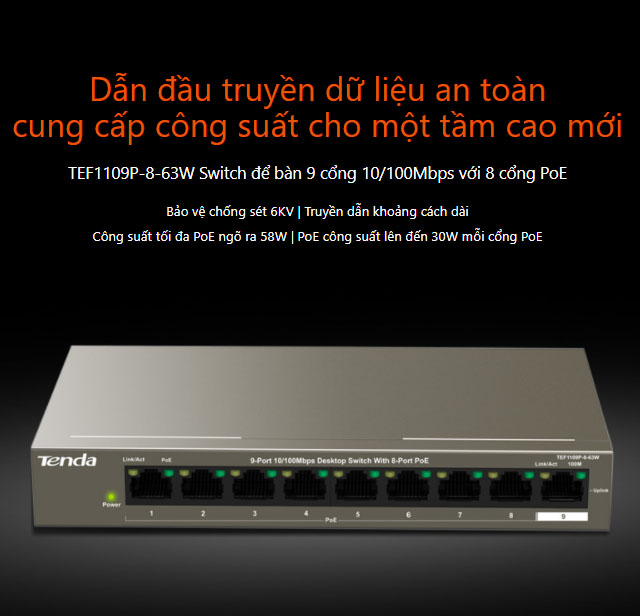 Bộ chia mạng switch 9 cổng 10/100Mbps TEF1109P-8-63W Tenda chính hãng Được thành lập vào năm 1999, Tenda Technology là nhà cung cấp nổi tiếng hàng đầu cho các thiết bị mạng, cam kết