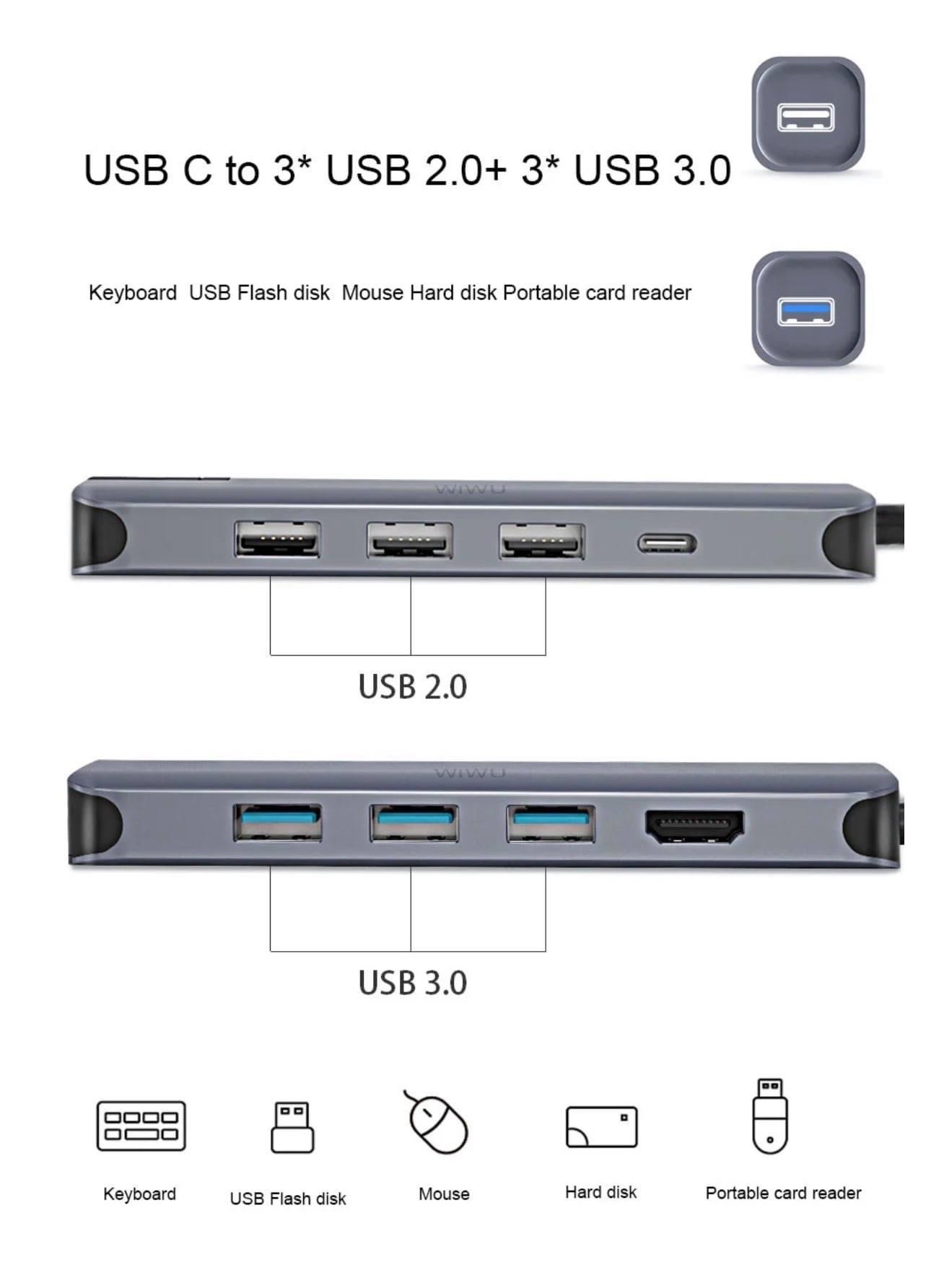 - Bộ điều hợp WIWU 6 trong 1 Type-C: 1 x Cổng HDMI: Cách dễ nhất để thiết lập thêm màn hình hoặc máy chiếu. Thưởng thức Ultra HD (4K) ở 30Hz hoặc Full HD (1080p) ở 60Hz với âm thanh độ nét cao; 2 x Cổng USB 3.0: USB3.0 hỗ trợ tốc độ lên đến 10Gbps; 2 x Khe cắm thẻ nhớ SD / Micro SD: Hỗ trợ SD / SDHC / SDXC, SD3.0 UHS-1, lên đến 104MB / S, dung lượng lên đến tối đa 128GB; 1 x Cổng Ethernet: hỗ trợ 100/1000 Mbps.