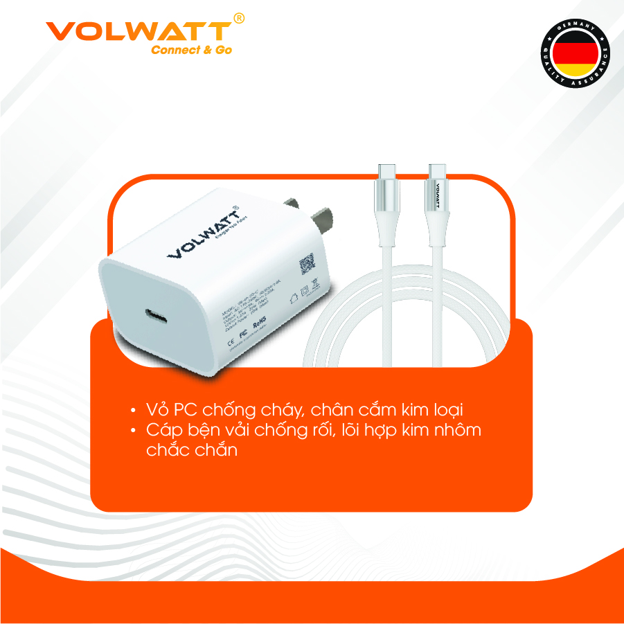Mua tại TiktokBộ sạc nhanh Volwatt GE-20-SCC 20W – Giải pháp tối ưu cho nhu cầu sạc nhanh, an toàn và ổn định. Bộ sản phẩm gồm: