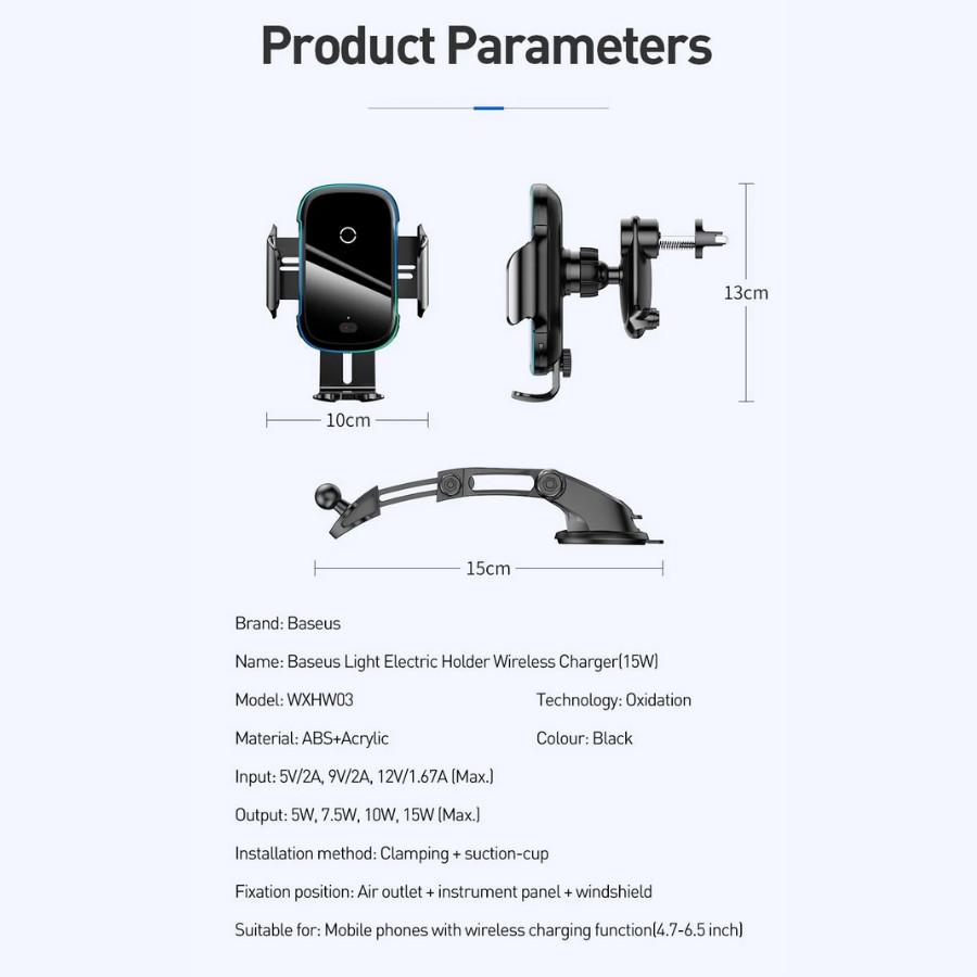 - Tính năng cơ bản Bộ đế giữ điện thoại dùng trên xe hơi Baseus Light Electric Holder Wireless Charger 15W Công dụng : Bộ đế giữ ( giá đỡ) điện thoại . Giúp bạn có thể vừa lái xe vừa quan sát được màn hình và sử dụng nhanh điện thoại dễ dàng . Phù hợp với nhiều loại điện thoại khác nhau với kích thước màn hình từ 4" đến 6.5" .