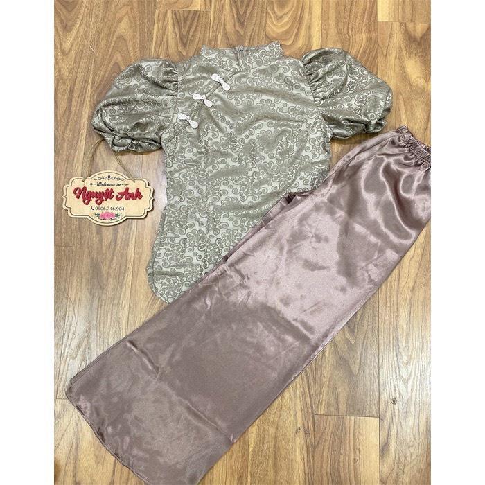 - Áo thiết kế cổ trụ tay phồng trang trọng kính đáo họa tiết gấm nổi sang trọng