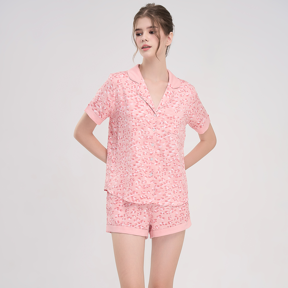 Đặc điểm nổi bật: - Bộ short satin màu hồng - tay ngắn + cổ dalton + đắp túi ngực + phối dây ruband - đô thân sau - Chất liệu satin - Dáng bộ