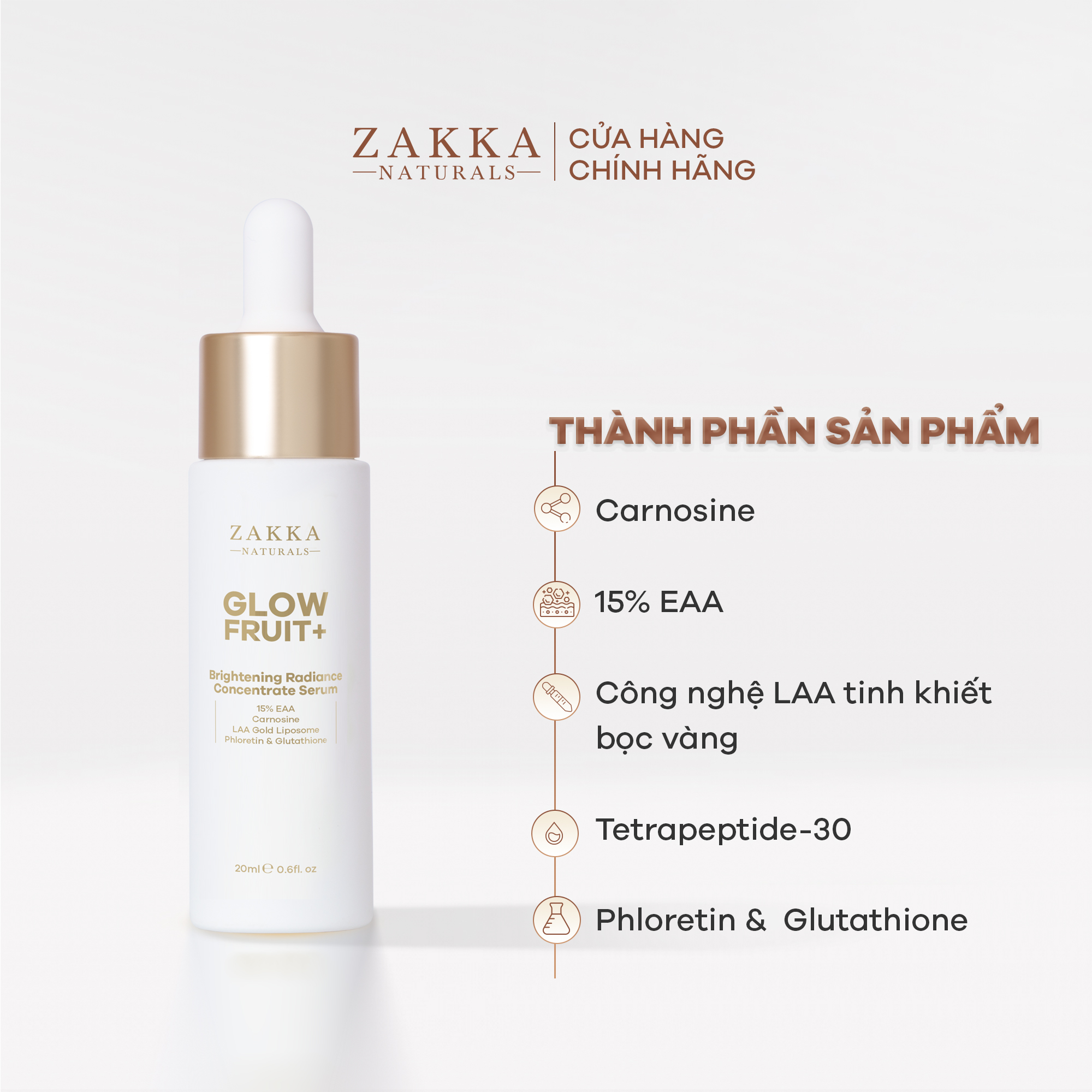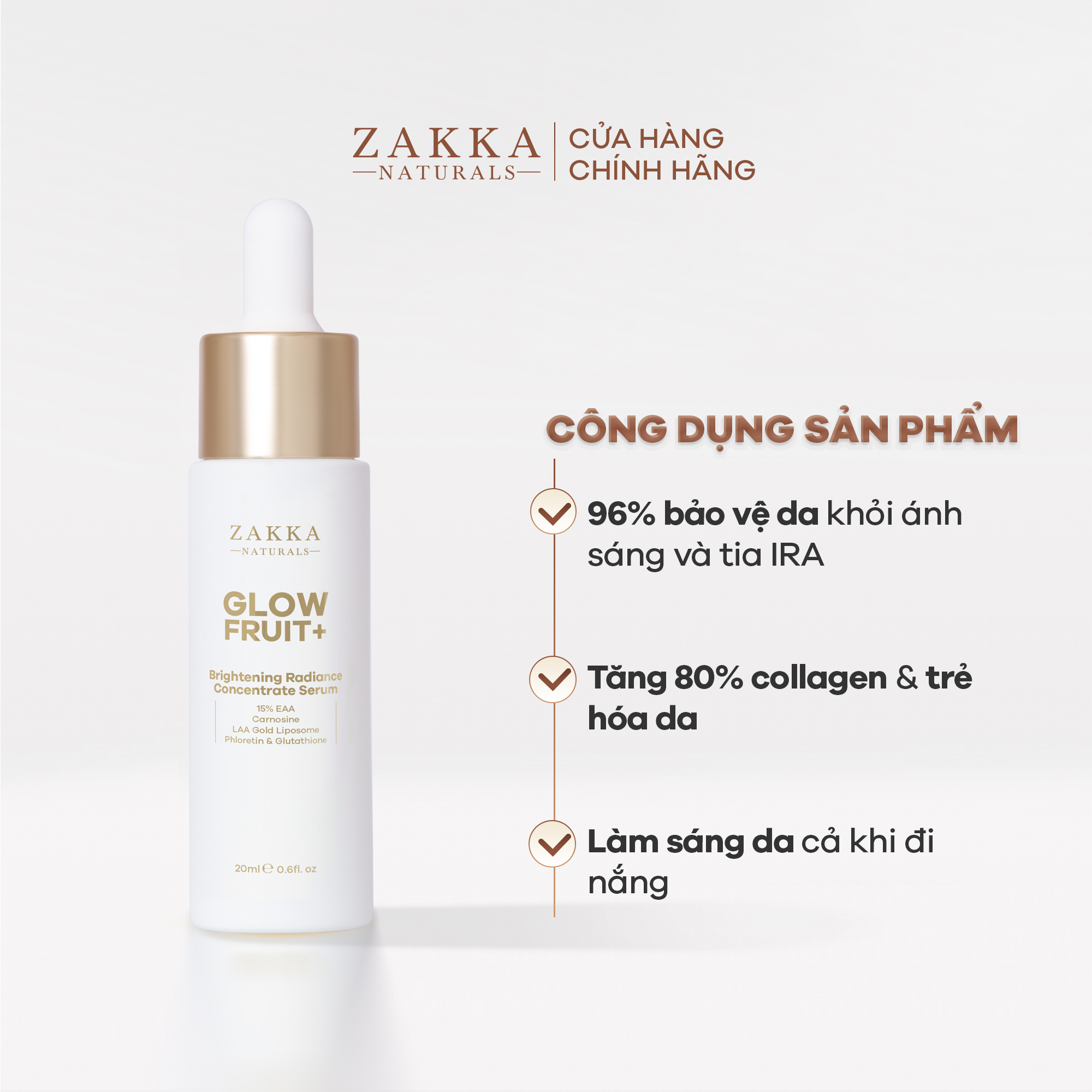 - Serum Vitamin C Zakka Naturals Glow Fruit+ Serum (Tinh Chất) Vitamin C Zakka Naturals GlowFruit+ Brightening với công thức tiên phong gồm Carnosine - Hoạt chất chống đường hóa (Anti Glycation) giúp giảm sắc vàng trên da, chống lão hóa và bảo vệ làn da khỏi tác động của các loại ánh sáng (tia UVs, IR và ánh sáng khả kiến). Đồng thời, sản phẩm còn chứa tổ hợp chống oxy hóa mạnh mẽ giúp trung hòa gốc tự do gây hại cho da, bao gồm: 15% 3-O-Ethyl Ascorbic Acid, Phloretin, từ táo xanh cùng công nghệ L-Ascorbic Acid tinh khiết bọc vàng giúp tăng khả năng thẩm thấu đến 2,5 lần và xác định đúng vị trí cần sửa chữa.