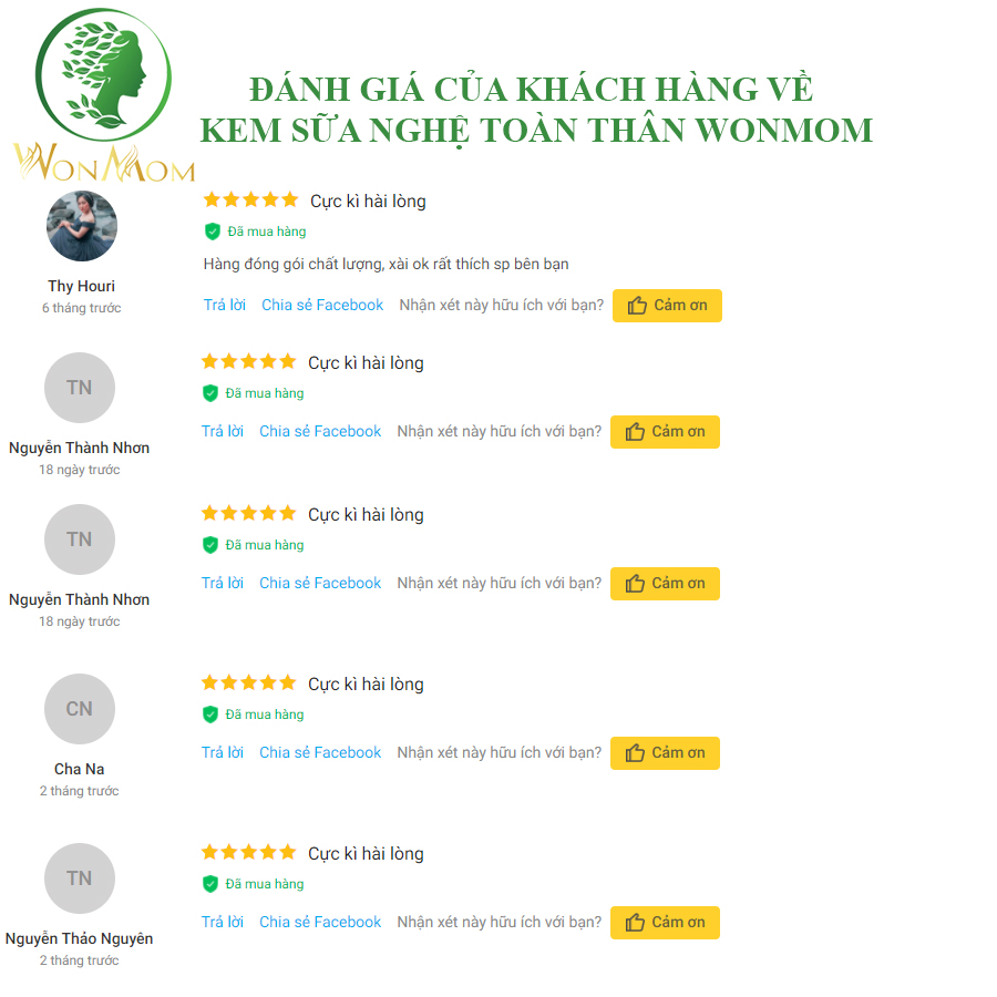 - Tác dụng từng thành phần: Kem sữa nghệ Wonmom: Thành phần chính của nghệ là Curcumin quý giá, hợp chất chống oxy hóa mạnh, chất chống viêm, diệt khuẩn nên có khả năng đẩy lùi các sắc tố melanin giúp dưỡng trắng da, cải thiện dấu hiệu lão hóa da, điều trị nám, trị tàn nhang, trị mụn, trị sẹo,… hiệu quả. Dầu hạt nho có chứa axit linoleic có công dụng ngăn ngừa bít tắc lỗ chân lông, ngăn ngừa mụn đáng kể. Tinh dầu jojoba giàu vitamin E đặc biệt là vitamin E NNO có tác dụng dưỡng ẩm, giúp da mịn màng. Trong nhân sâm có chứa thành phần Saponin giúp da hồng hào, căng mịn và tươi sáng hơn. Vitamin E giúp dưỡng trắng da nhờ tác dụng đặc biệt giúp chữa lành tổn thương do tia cực tím, ánh nắng mặt trời gây ra như sạm da, nám da,… và các sẹo tổn thương lâu năm như vết thâm do sẹo và mụn để lại. Thảo mộc xông vùng kín Wonmom: Lá chè xanh chứa 1 hợp chất có tên là EGCG, có tác dụng sát khuẩn và tiêu diệt một số vi khuẩn gây ra viêm nhiễm phụ khoa dạng nhẹ. Tinh dầu từ ngải cứu có tác dụng khử mùi hôi khó chịu ở vùng kín đồng thời hỗ trợ đào thải các dịch nhầy ứ đọng ra bên ngoài. Hỗ trợ se khít vùng kín và hỗ trợ đẩy lùi tình trạng viêm nhiễm phụ khoa. Nghệ chứa lượng lớn curcumin giúp làm hồng “ cô bé ” tự nhiên, an toàn mà lại thơm tho, sạch sẽ. Kim ngân hoa và xà sàng tử giúp cân bằng độ PH ở vùng kín, kháng khuẩn, loại bỏ các bệnh viêm nhiễm. 5.Chất lượng sản phẩm: