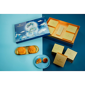 Bộ hộp Bánh trung thu Thịnh Vượng - Thành Long gồm 4 bánh: Nhân thập cẩm vi cá - gà quay - jambon ( 270g ) Nhân gà quay lạp xưởng ( 270g ) Nhân