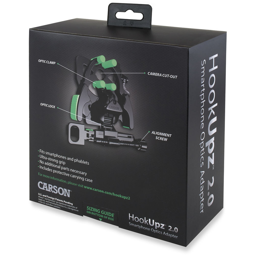 HookUpz 2.0 được cấp bằng sáng chế đã được thiết kế để phù hợp với tất cả các điện thoại thông minh phổ biến trên thị trường, bao gồm cả điện thoại và phablet có kích thước lớn hơn - ngay cả khi chúng được bật! Nó siêu nhỏ gọn, nhẹ và có thiết kế thân thiện với người dùng. Kết nối điện thoại thông minh hoặc phablet với cáp quang của bạn thật nhanh chóng và dễ dàng. Kẹp điện thoại và khóa cam quang độc quyền đảm bảo kẹp chặt cả điện thoại và cáp quang của bạn. Nó phù hợp với nhiều loại quang học với đường kính thị kính ngoài 25-58mm. Cất HookUpz 2.0 trong hộp đựng bằng xốp cứng đi kèm khi không sử dụng.