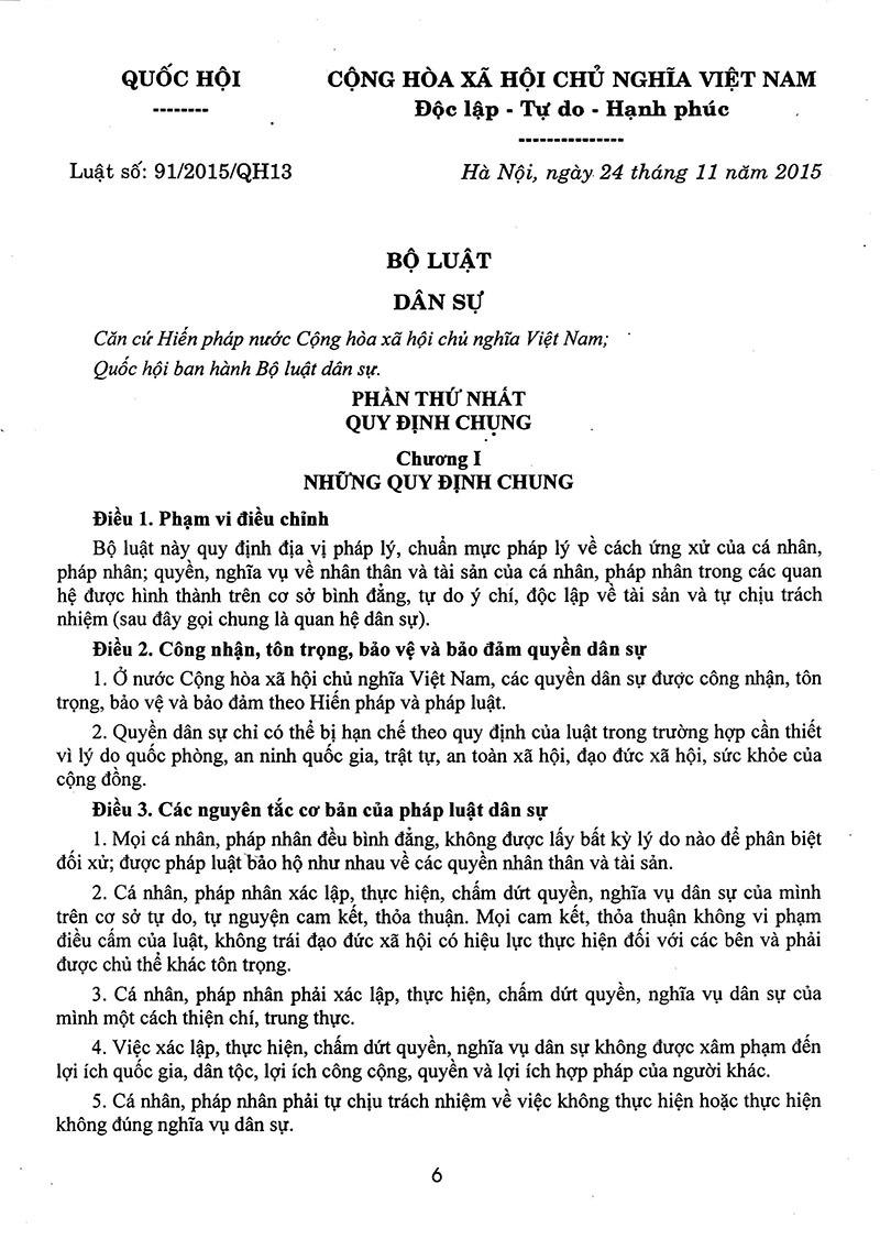 Ngày 24/11/2015, tai kỳ họp thứ 10, Quốc hội khóa XIII đã thông qua BLDS số 91/2015/QH13, có hiệu lực thi hành từ ngày 01/01/2017. Việc ban hành bộ luật lần này nhằm xây dựng