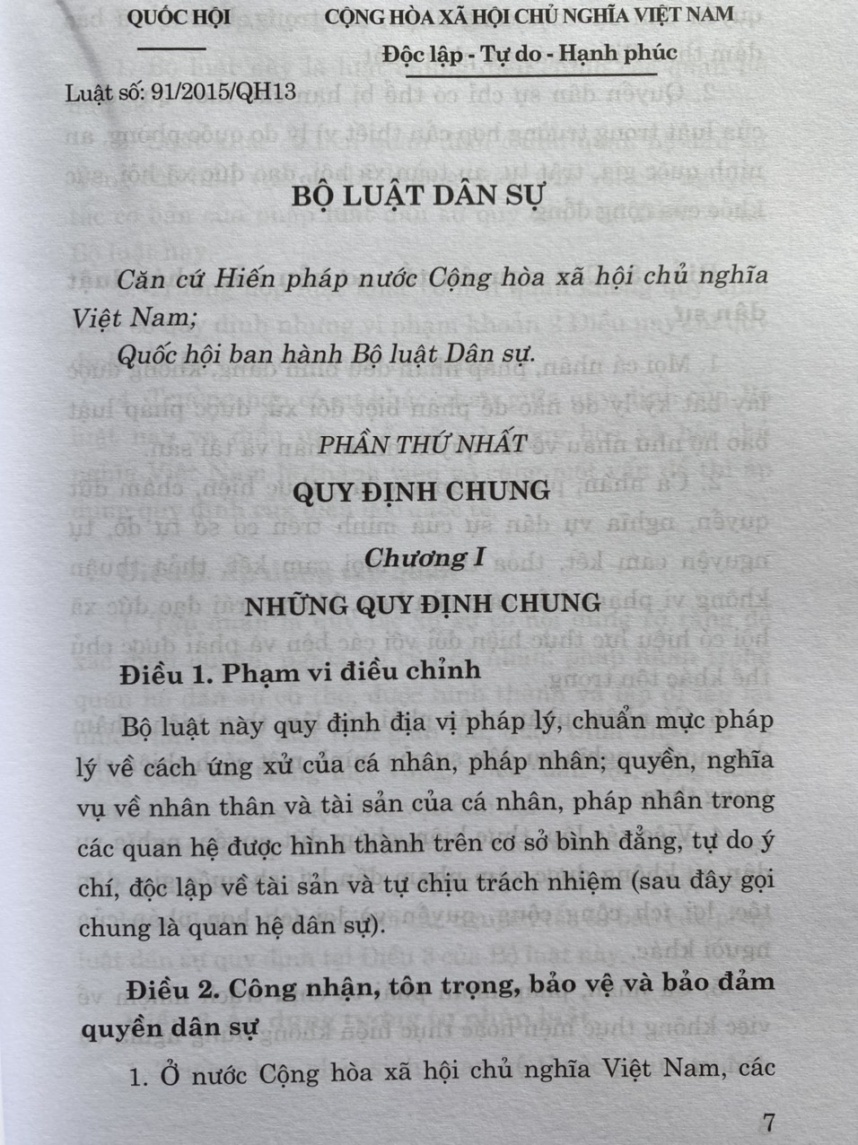Bộ Luật Dân Sự 2015 - P1. Chương 1. NHỮNG QUY ĐỊNH CHUNG (Điều 1-7)