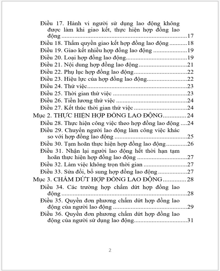 Chương 1: NHỮNG QUY ĐỊNH CHUNG Chương 2: VIỆC LÀM TUYỂN DỤNG VÀ QUẢN LÝ LAO ĐỘNG Chương 3: HỢP ĐỒNG LAO ĐỘNG Chương 4: GIÁO DỤC NGHỀ NGHIỆP, PHÁT TRIỂN KỸ NĂNG NGHỀ Chương
