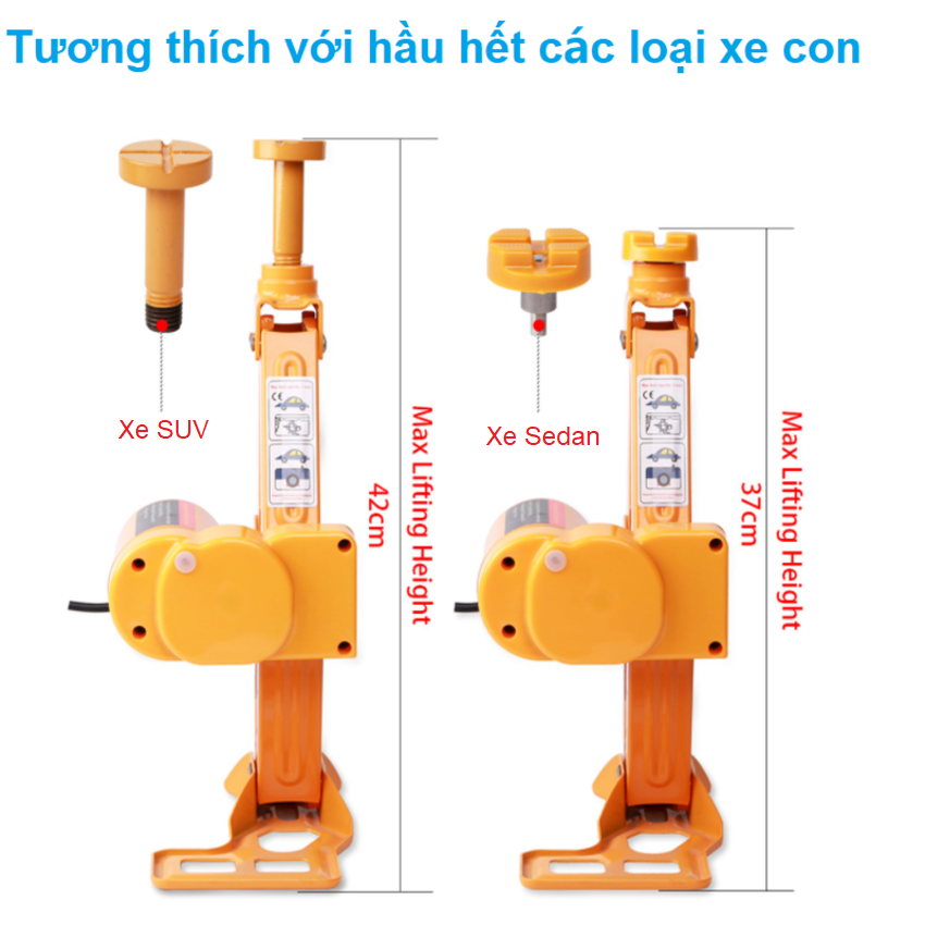 - Kích (con đội an toàn) với hành trình từ 12-35cm, 12-37 và 17-42cm, thời gian nâng 2-3 phút