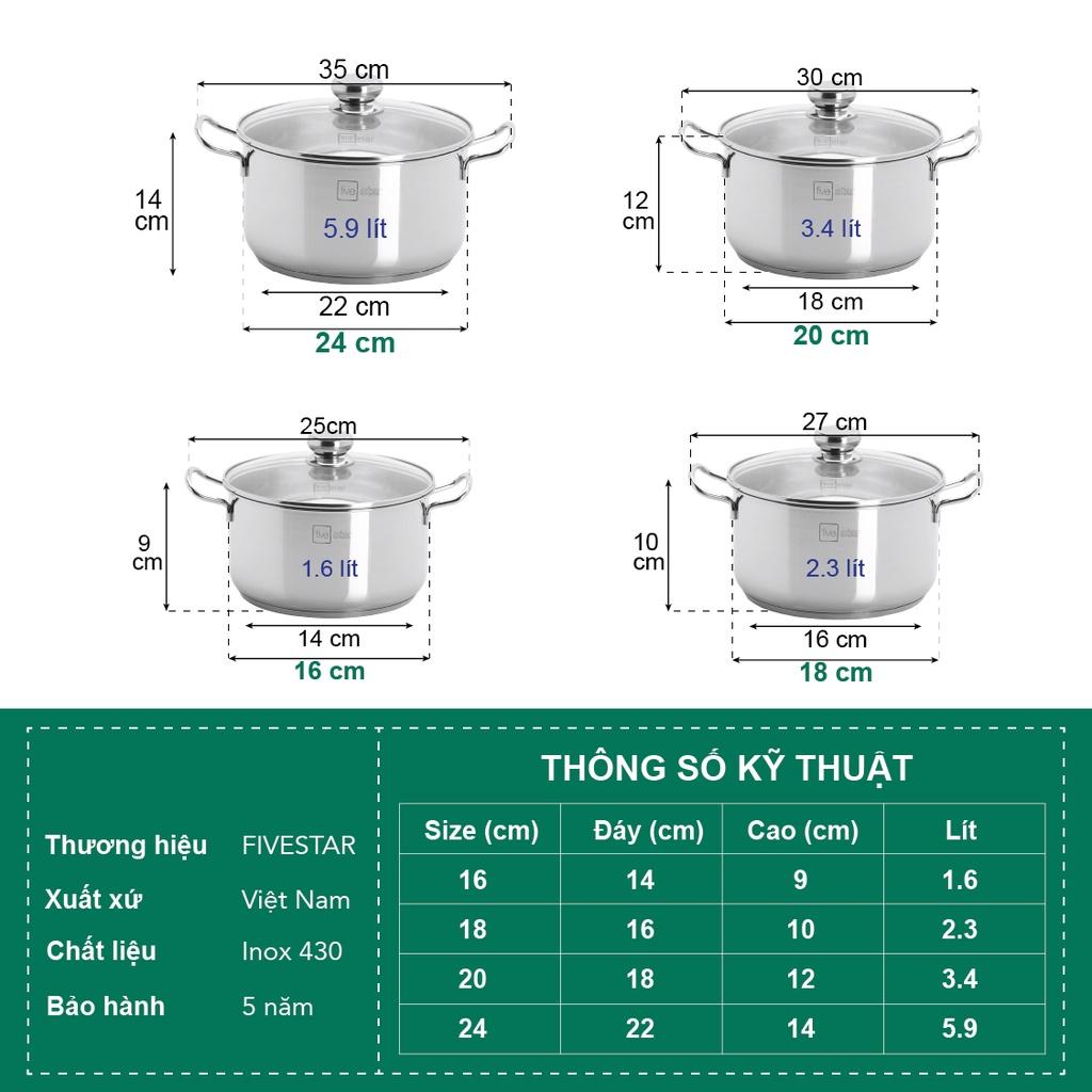 Bộ nồi chảo xửng hấp 3 Đáy Inox 430 cao cấp Fivestar Standard bếp từ nắp kính , tặng 1 vá canh Bộ nồi inox có 9 món gồm : +Quánh có đường kính
