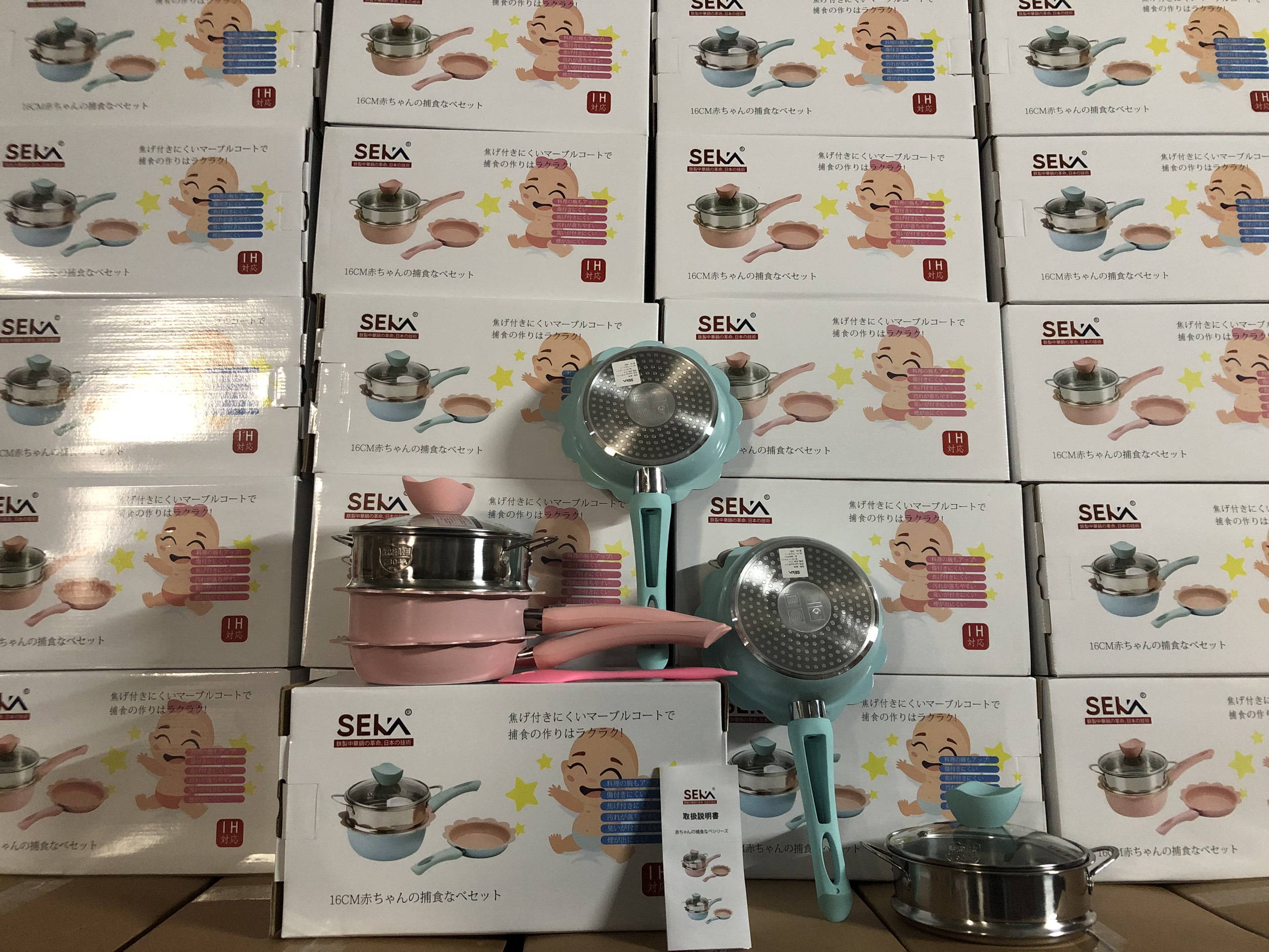 Bộ nồi chảo đá nấu ăn dặm cho bé -men đá chống dính kèm xửng hấp inox hình hoa tráng men đá cao cấp