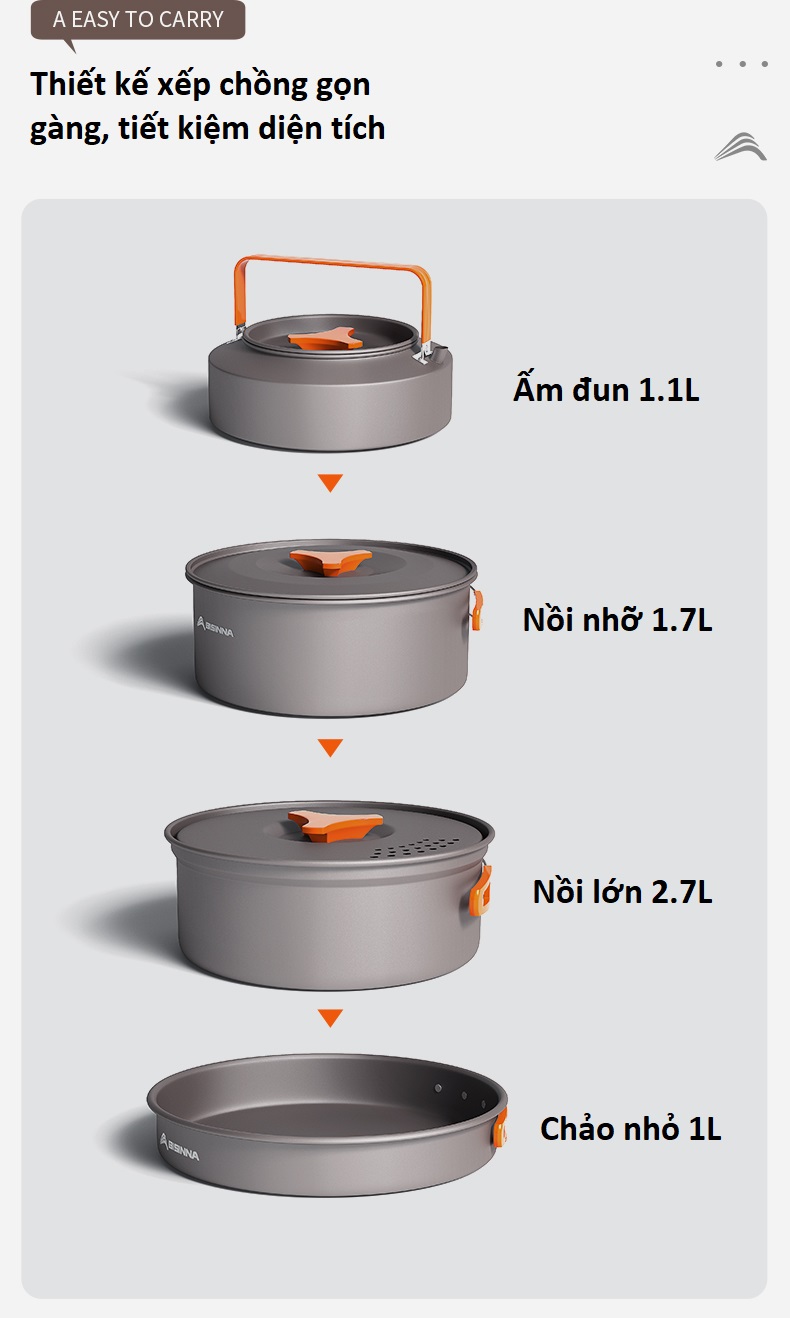CÔNG DỤNG SẢN PHẨM – Đây là bộ nồi được thiết kế cực kỳ gọn, nhẹ. Dễ dàng bỏ vào bất cứ balo nào, chống dính, sẵn sàng cho tất cả các món chiên, canh, xào, và cả nấu cơm. Sản phẩm phù hợp cho các chuyến đi dã ngoại, leo núi, – Xuất xứ: Trung Quốc