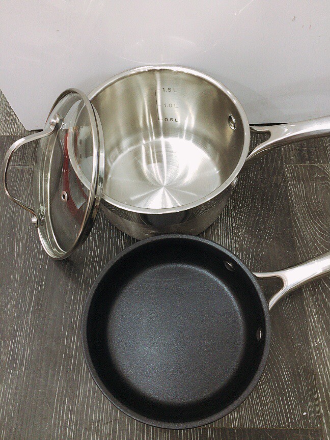 Bộ nồi gồm: 1 nồi 16cm, 1 nồi 20cm, 1 chảo chống dính 20cm.
