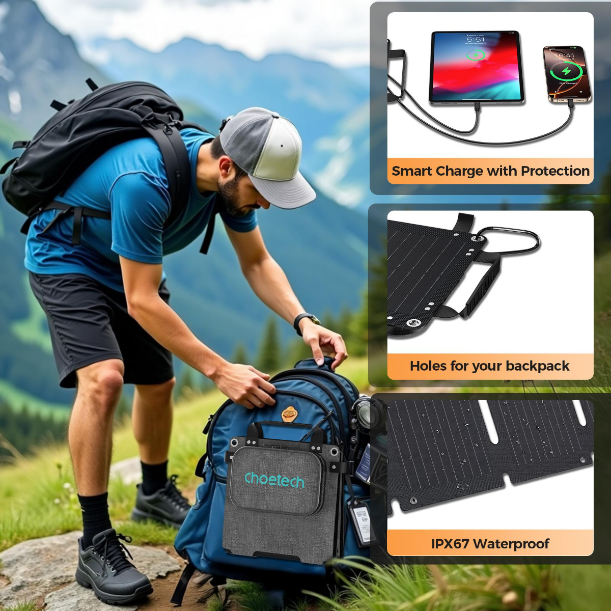 - Sử dụng khi mất điện, thiên tai hoặc trong các khu vực hẻo lánh.. – Sử dụng bộ sạc năng lượng mặt trời Choetech SC005-V5 không chỉ giúp bạn tiết kiệm chi phí mà còn góp phần bảo vệ môi trường. Bộ sạc được thiết kế với vật liệu cao cấp, chống thấm nhẹ và chống bụi, phù hợp với điều kiện thời tiết đa dạng. *Lưu ý:Vị trí đặt tấm năng lượng mặt trời di động cũng phụ thuộc vào hướng và góc độ của ánh sáng mặt trời. Đối với kết quả tốt nhất, hãy đảm bảo tấm năng lượng mặt trời nhìn thẳng vào ánh sáng mặt trời trong khoảng thời gian có nhiều ánh sáng nhất trong ngày. – Để tối ưu hóa hiệu suất của tấm năng lượng mặt trời di động, bạn nên xem xét một số yếu tố khác sau đây: