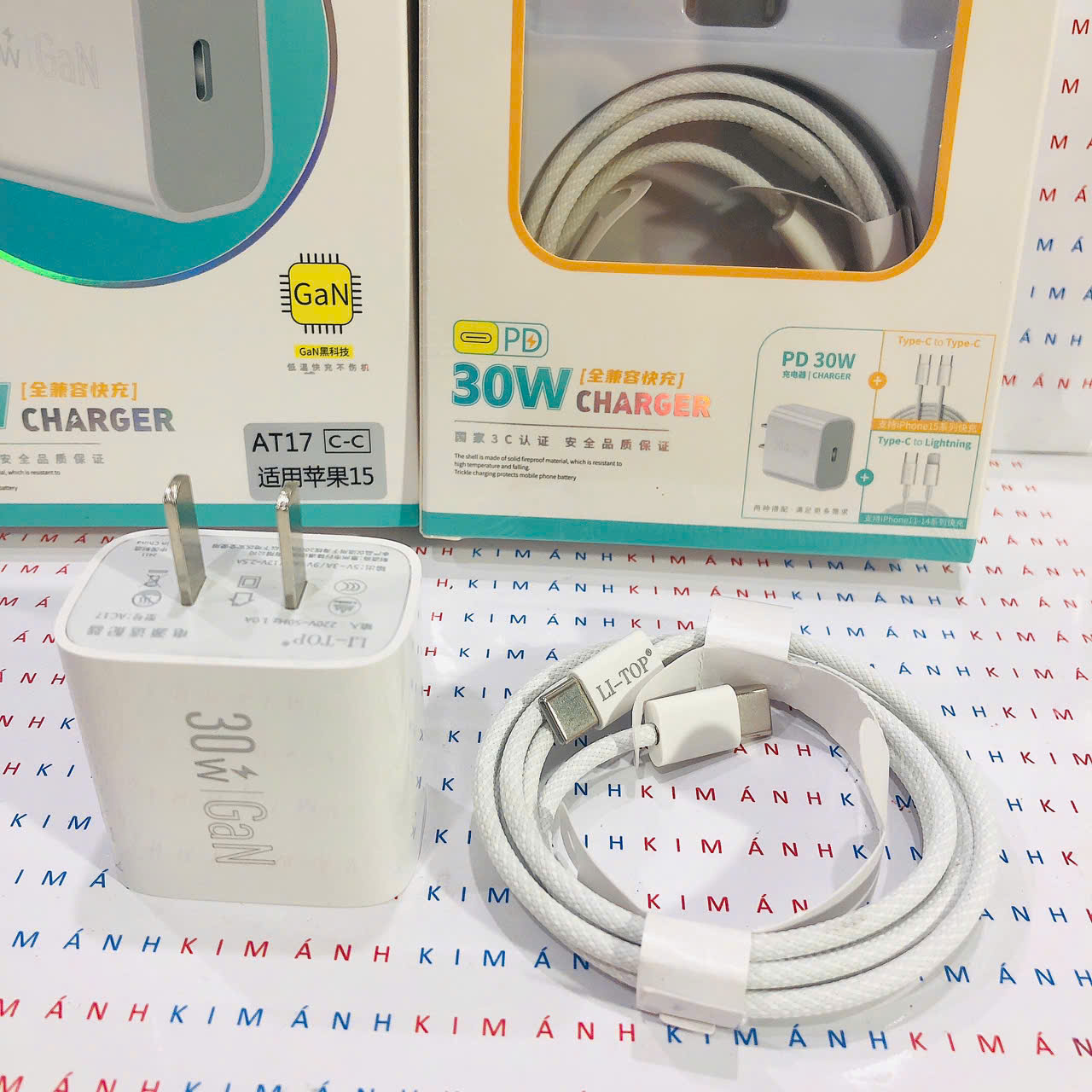 -Tất cả các sản phẩm của Kim Ánh bán điều có chính sách dùng thử trong 30 ngày để kiểm nghiệm chất lượng sản phẩm, trong thời gian này bạn hoàn toàn có thể trả hàng mà không cần lý do (giữ lại Seal, tem của Shop, quà tặng), phí vận chuyển về Shop là 15k trong trường hợp sản phẩm không bị lỗi   ️Cty Kim Ánh đạt giải nhất về chế độ bán hàng ưu việt nhất trong khu vực, khách yên tâm tin dùng nhé!!!!️ ------------------------------------------------------- Bộ sạc nhanh LI-TOP GaN AT17 chân Type C công suất PD 30W, có chứng nhận 3C tiêu chuẩn quốc gia, hàng chính hãng, cho dùng thử 30 ngày hoàn trả   Sản phẩm Li-Top do Kim Ánh nhập trực tiếp về, trên thân và hộp có khắc dấu chứng nhận 3C tiêu chuẩn quốc gia, có cod truy xuất nguồn gốc sản phẩm, qua kiểm định nghiêm ngặt an toàn thiết bị điện , shop sẽ gửi kèm giấy chứng nhận theo đơn hàng đến cho khách, cam kết sản phẩm chính hãng sai 1 đền 100 Củ sạc Li-top công suất sạc nhanh 30W, cổng Type C   Dây cáp Li-Top kéo tải 30w, khắc logo 2 mặt đẹp, chân Type C ra Type C   Bộ sạc LI-TOP GaN AT17 sử dụng công nghệ sạc GaN có mặt trên những sản phẩm củ sạc, adapter sử dụng chất liệu Gallium Nitride. GaN giúp thu nhỏ kích cỡ của các loại sạc nhanh, đồng thời tối ưu nhiệt lượng tỏa ra từ củ sạc, khiến sạc mát hơn và an toàn hơn. GaN thể hiện hiệu quả rất tốt trong việc xử lý thiết bị điện năng cao   Hợp chất GaN dẫn điện tốt hơn và cắt giảm được nhiệt năng, dòng điện sẽ hướng về thiết bị sạc nhanh hơn. Điều này vừa tiết kiệm điện vừa tiết kiệm thời gian sạc.