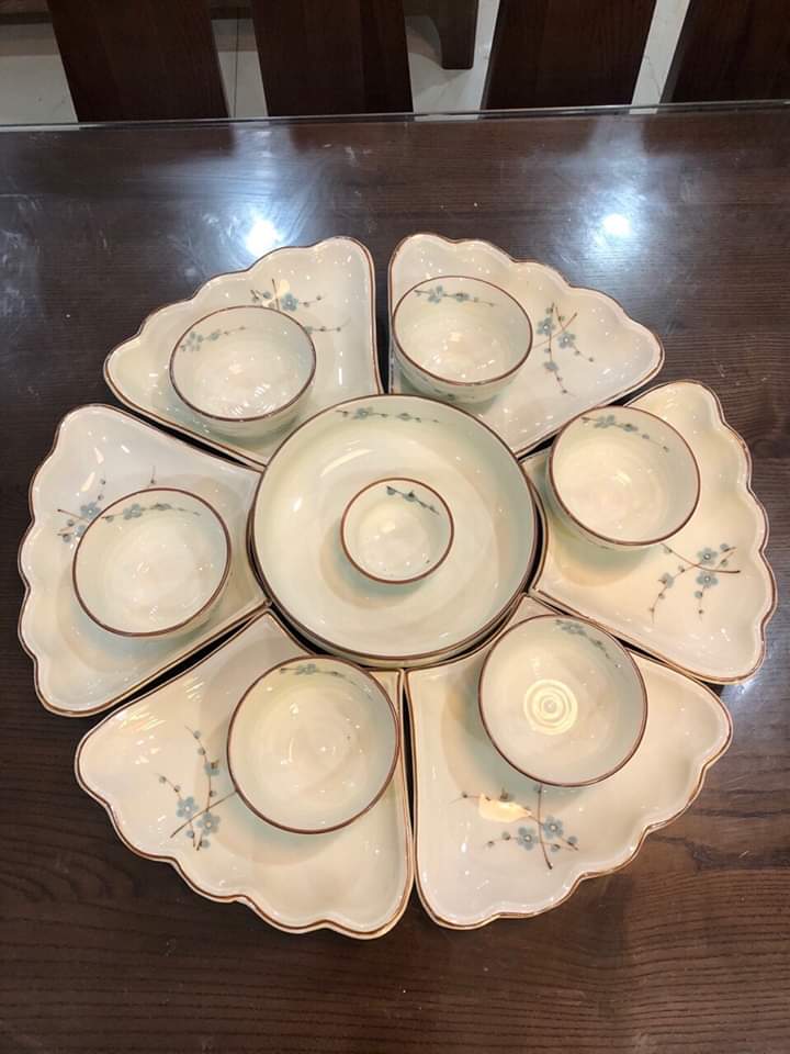 Bộ đồ ăn Bát Tràng - Sản phẩm bao gồm: 6 bát cơm, 1 mắm, 1 muối, 1 tô 16, 1 tô 18, 1 đĩa tròn 14, 1 đĩa tròn 16, 1 đĩa tròn 18,
