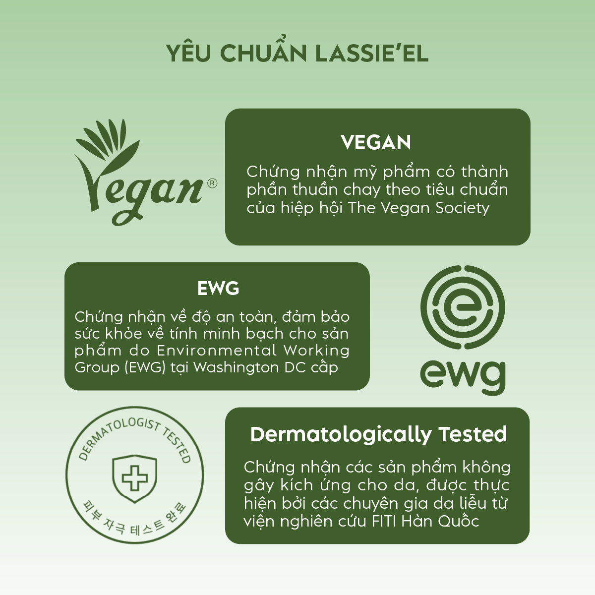 Tất cả các sản phẩm của Lassie'el đều đã được chứng nhận công dụng và hơn 5 loại kiểm nghiệm độ an toàn cho da, kể cả da nhạy cảm (chi tiết vui lòng xem tại mục mô tả của từng loại sản phẩm trong gian hàng).