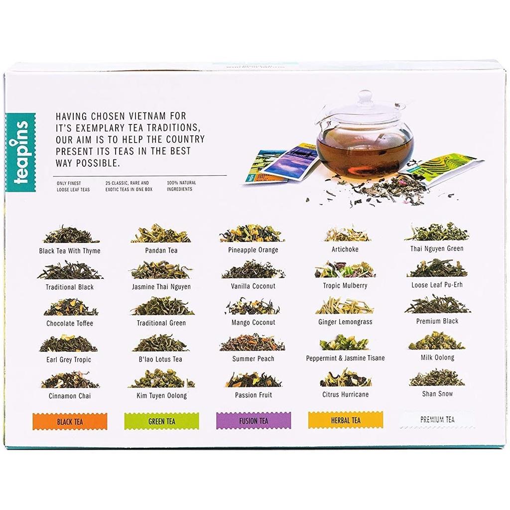 Gift Tea Set Vietnam Delights là bộ nếm thử với nhiều lựa chọn hương vị hấp dẫn, bao gồm 25 loại trà Việt Nam: 5 đen, 5 xanh, 5 thảo mộc, 5 hợp nhất và 5 loại trà thượng hạng. Mỗi loại trà được đóng gói trong một gói riêng (5g), hoàn hảo cho một ấm trà cỡ vừa.