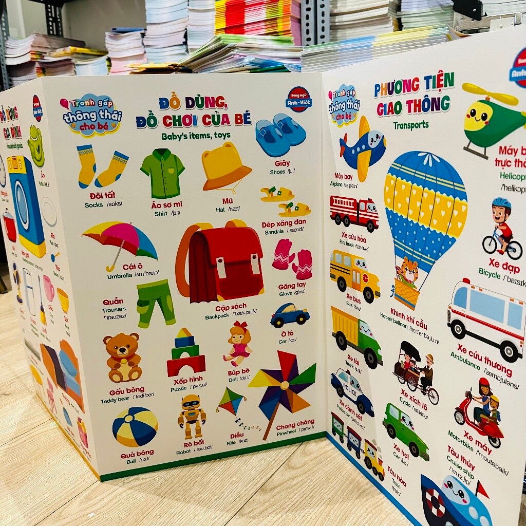 Mua tại TiktokBộ Tranh Gấp Thông Thái Cho Bé - Song Ngữ Anh Việt - 3 Tấm, 6 Mặt, 17 Chủ Đề, Kích Thước 96 x 50cm THÔNG TIN SẢN PHẨM:
