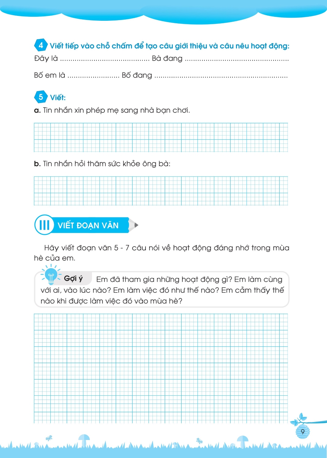 - Bài tập nâng cao: Phần này sẽ cung cấp 1 số các bài tập và hoạt động mang tính thử thách hơn, để các em thử sức, luyện tập tư duy sâu từ đó trau dồi và nâng cao kiến thức. Cuốn sách cũng cung cấp 3 đề ôn tập cuối kì với thang điểm cụ thể, để các em tự ôn luyện và đánh giá đúng mức độ nắm kiến thức, chuẩn bị tốt kiến thức và tâm lý cho bài kiểm tra cuối kì.