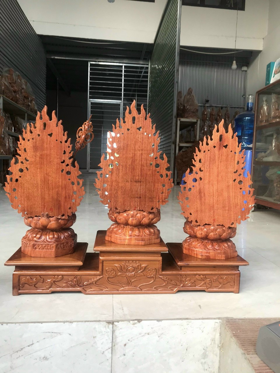Bộ tượng phật tam thánh bằng gỗ hương đá kt cao 50×25×25cm cả lá chắn hòa quang là cao 60cmBộ tượng phật tam thánh bằng gỗ hương đá kt cao 50×25×25cm cả lá chắn hòa quang là cao 60cm