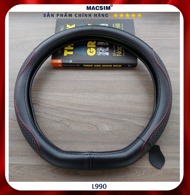 Bọc vô lăng cao cấp Macsim mã Dcut mã L990 màu đen chỉ đỏ chất liệu da thật 100%,- chất liệu da thật 100%, lõi ruột vô lăng được sản xuất từ silicon cao cấp