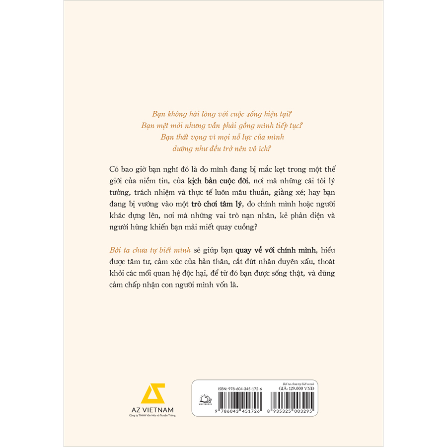 BỞI TA CHƯA TỰ BIẾT MÌNH sẽ giúp bạn quay về với chính mình, hiểu được tâm tư, cảm xúc của bản thân, cắt đứt nhân duyên xấu, thoát khỏi các mối quan hệ độc hại, để từ đó bạn được sống thật, và dũng cảm chấp nhận con người mình vốn là.