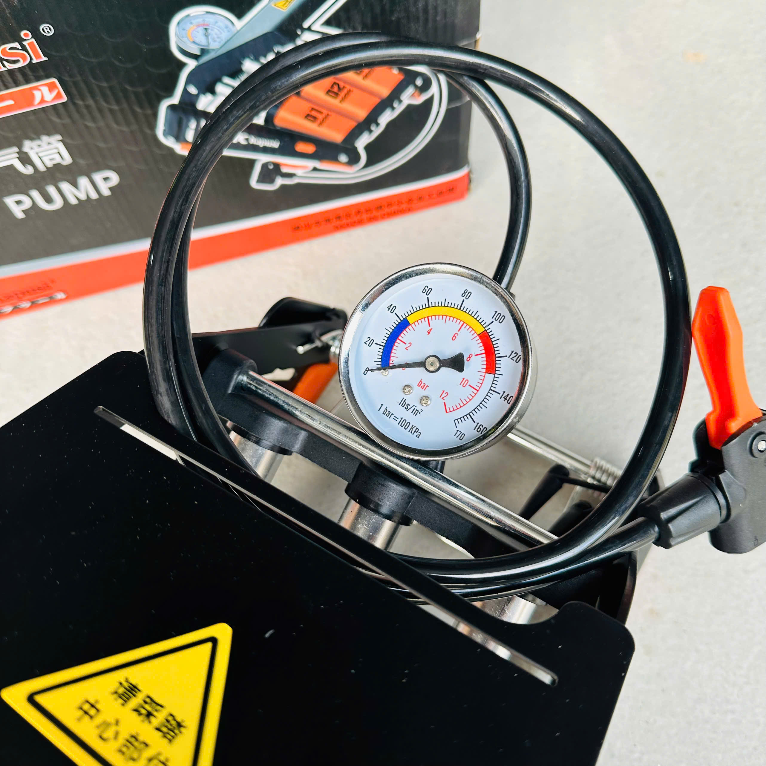bơm đạp chân dùng bơm xe máy bơm xe đạp với các đầu van đa năng ĐẶC ĐIỂM SẢN PHẨM: - Để sàn bơm chân, dễ vận hành; - Thùng và trục hợp kim nhôm;