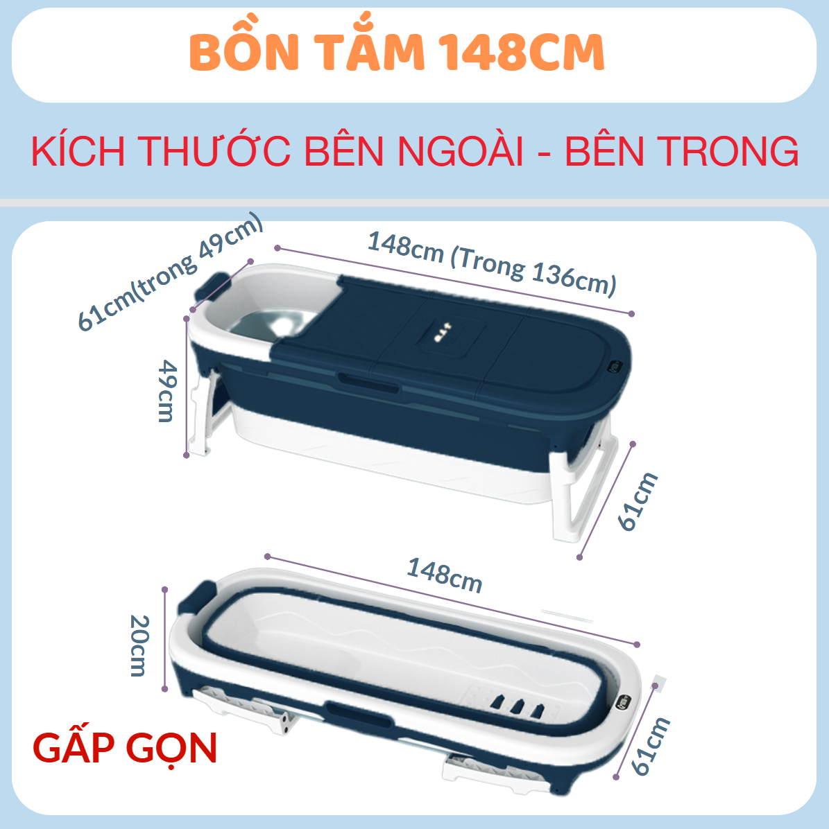 Size 148 cm: Kích thước đầy đủ 1486149 cm – gấp gọn 1486120cm, có nhiệt kế khách lắp pin khi có nhu cầu sử dụng