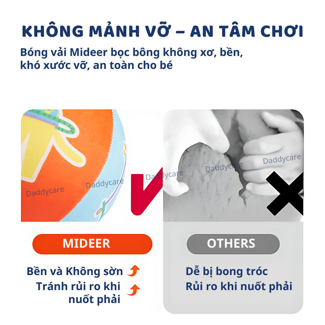 - KHÔNG MẢNH VỠ – AN TÂM CHƠI: Bóng vải Mideer được bọc một lớp bông không xơ, bền bỉ, không dễ bị xước hay vỡ mảnh như các loại bóng yên tĩnh thông thường, tránh nguy cơ con nuốt phải.