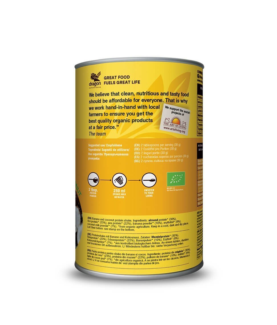 - Có thể thêm chuối, việt quất hoặc các loại trái cây yêu thích khác của bạn. Protein shake chuối và dừa của Dragon Superfoods ko có hương thơm và chất điều vị nhân tạo, ko chứa lactose và gluten. Thành phần: Protein hạnh nhân (30%), protein gạo (23%), protein đậu hà lan (22%), bột chuối (10%), đường ăn kiêng erythritol (8%). bột sữa dừa (7%).* từ nông nghiệp hữu cơ có chứng nhận. Cách sử dụng: 2 thìa bột protein shake (30g) với 250ml sữa thưc vật, sữa bò hoặc nước. Thêm chất tạo ngọt nếu muốn.