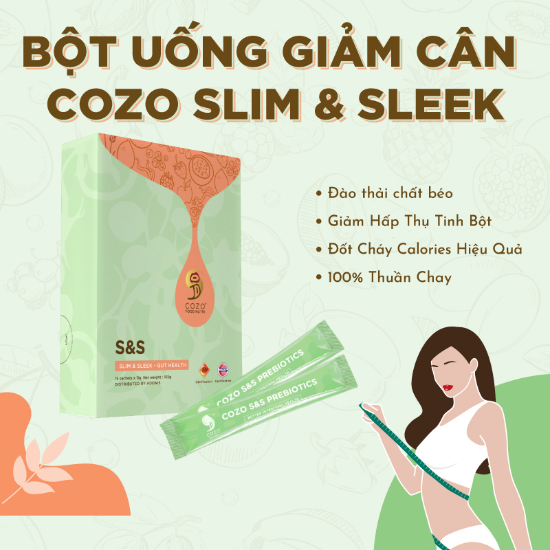 • Các thói quen xấu khác Tác dụng của Bột uống hỗ trợ giảm cân và chăm sóc hệ tiêu hóa Cozo Slim & Sleek • 100% nguồn gốc từ thực vật, bổ sung dinh dưỡng cần thiết • Đào thải chất béo và chất liên kết các mô mỡ • Phá vỡ chất béo và giảm lượng carbohydrate  • Chống đầy hơi và chướng bụng • Chống oxy hóa và chống glycation (tác nhân gây bệnh tiểu đường) • Tăng cường trao đổi chất và đốt kalo • Hàm lượng vitamin và khoáng chất cao • Trung hòa và điều chỉnh độ pH cho đường ruột • Tăng cường hệ thống miễn dịch hiệu quả Thành phần :