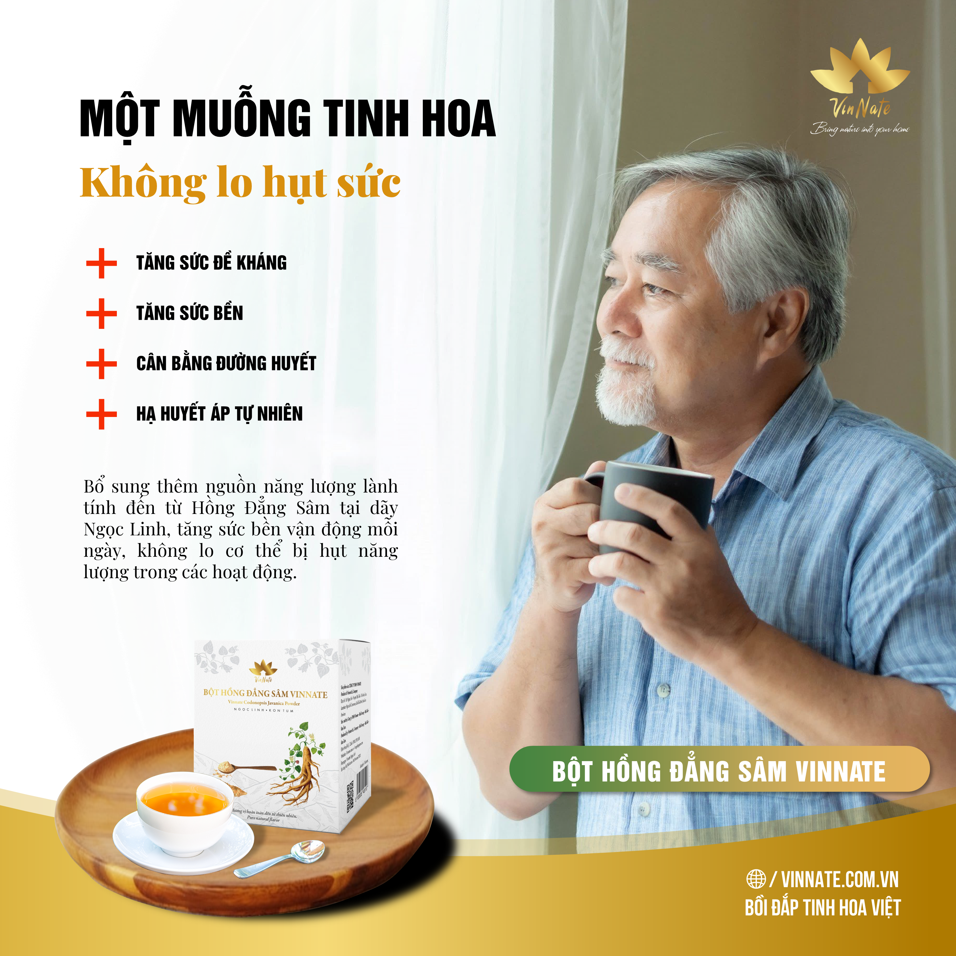 - Giúp giấc ngủ ngon và sâu hơn. Bột Hồng Đẳng Sâm Vinnate có hàm lượng dưỡng chất cao, giá thành tốt. Những Củ Hồng Đẳng Sâm tươi ngon và lâu năm được người dân địa phương lựa chọn và hái trên vùng núi thuộc dãy Ngọc Linh thuộc huyện Đắk Glei – Tỉnh Kon Tum , sau đó nguyên liệu nhanh chóng được vận chuyển về nhà máy sản xuất . Tại đây, Củ Hồng Đẳng Sâm được rửa sạch bằng nguồn nước đảm bảo vệ sinh an toàn và xử lý hấp, sấy bằng công nghệ sấy lạnh nhằm đảm bảo giữ nguyên được những dưỡng chất tốt nhất có trong nguyên liệu ban dầu . Sâm sấy xong được nghiền dưới cối đá granit siêu mịn nhằm đảm bảo khi hoà tan vào nước toàn bộ dưỡng chất có trong củ Hồng Đẳng Sâm sẽ được hấp thụ một cách tốt nhất vào cơ thể người dùng .