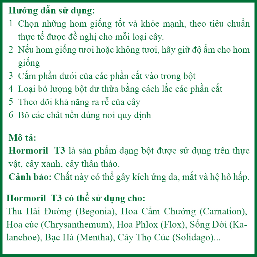 HORMORIL T-3 (bột rễ có chứa thành phần ngăn nấm): T with fungicide cực kỳ quan trọng đối với một số giống cây giâm cành nhạy cảm với vi khuẩn bên ngoài. Vì vậy, tùy loại cây cần giâm cành mà nhà vườn chọn lựa Homoril 3 hay Homoril T3 phù hợp.