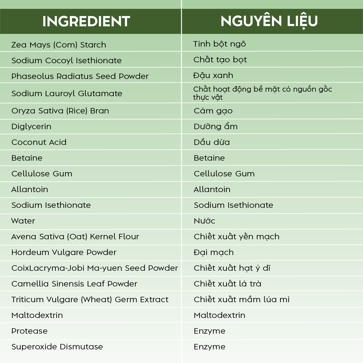 Thành phần Water, Stearic Acid, PEG-8, Myristic Acid, Lauric Acid, Glycerin, Potassium Hydroxide, Hydrolyzed Silk, Sodium Hyaluronate, Hydrolyzed Collagen, Honey, Butylene Glycol, Glyceryl Stearate SE, Disodium EDTA, Phytosteryl/Octyldodecyl Lauroyl Glutamate, Tocopherol, Polyquaternium-7, Phenoxyethanol, Fragrance. Công