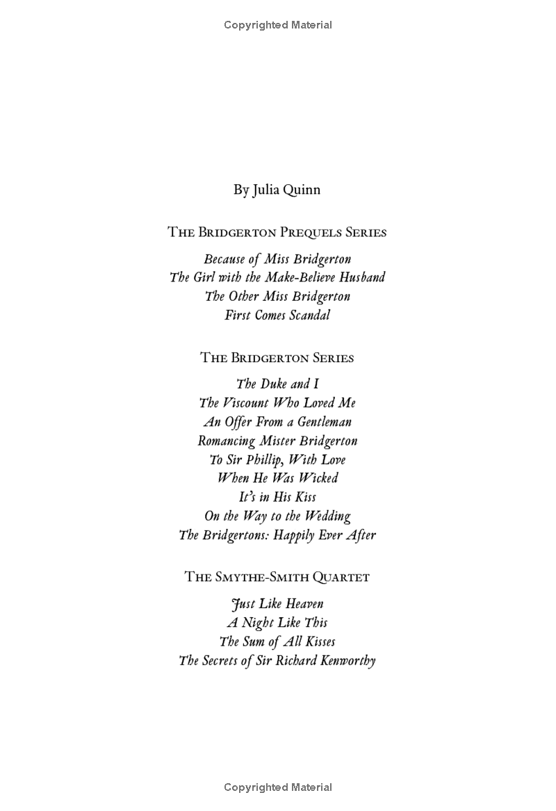 Penelope Featherington has secretly adored her best friend’s brother for . . . well, it feels like forever. After half a lifetime of watching Colin Bridgerton from afar, she thinks she knows everything about him, until she stumbles across his deepest secret . . . and fears she doesn’t know him at all.