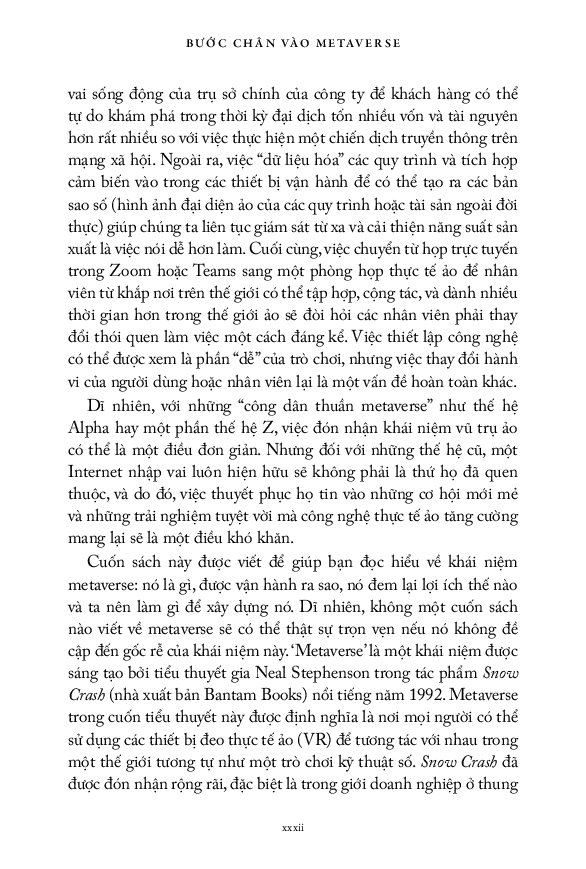 Bước chân vào Metaverse đem lại một cái nhìn sắc bén và thú vị về cách mà thế giới số hiện nay sẽ thay đổi khi metaverse trở thành hiện thực. Metavese sẽ thay đổi hoàn toàn những trải nghiệm hàng ngày của mỗi cá nhân, tổ chức, và xã hội trên toàn thế giới, cho phép chúng ta trong nháy mắt có thể trở thành bất cứ ai và đi đến bất cứ nơi đâu m.ình muốn. Đây là một cuốn sách thú vị có thể khiến bạn không ngừng đọc, là cuốn sách phải có trong tay của những nhà lãnh đạo cấp cao, những nhà quản lý và điều hành doanh nghiệp, những người muốn thực hiện chuyển đổi số. Đây cũng là một nguồn tài liệu quý báu cho bất kỳ ai quan tâm đến tương lai của công nghệ, Internet và tương tác xã hội.
