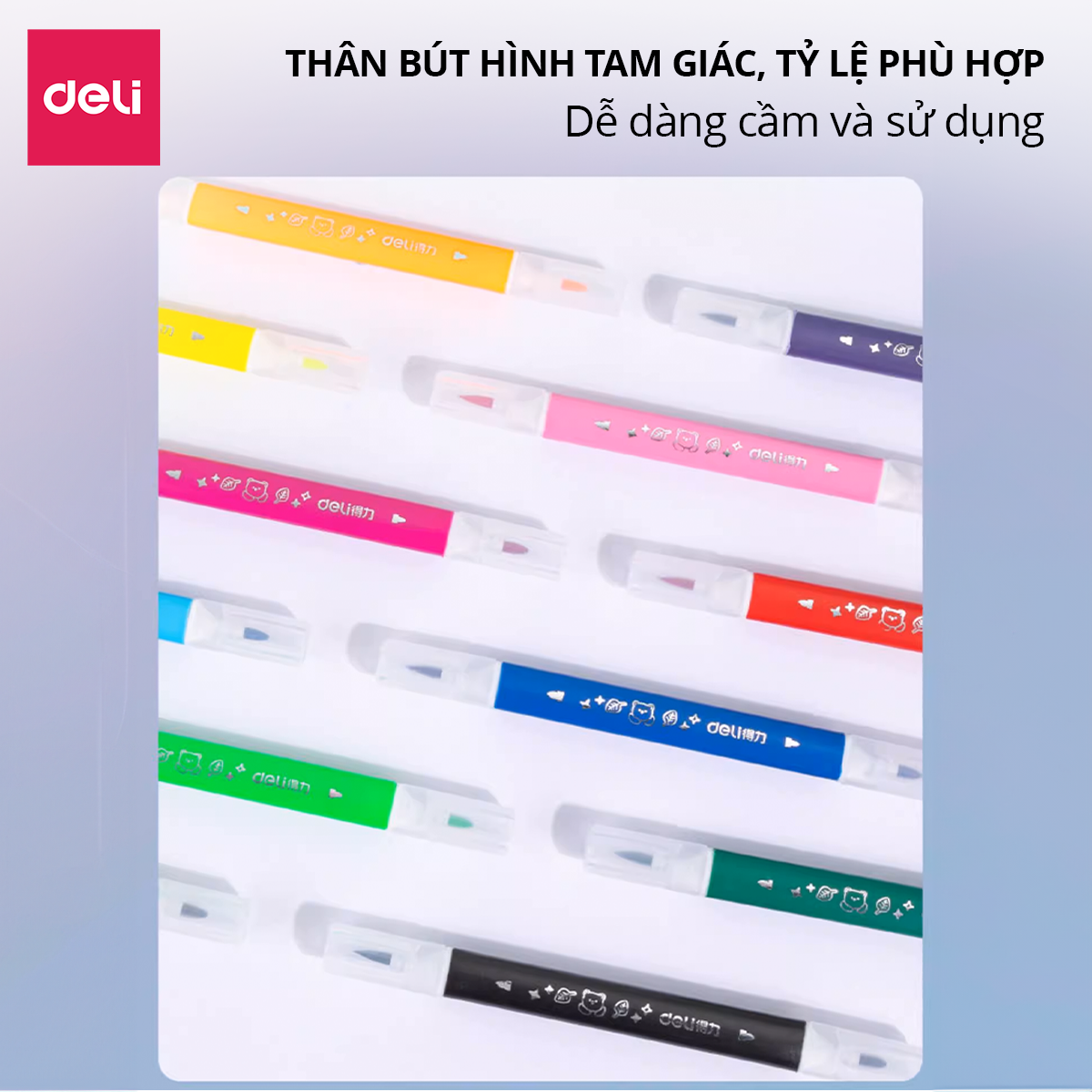 BÚT MÀU DẠ NƯỚC 2 ĐẦU DELI - ĐẦU CỨNG - MỀM - KÈM HỘP NHỰA TÍNH NĂNG SẢN PHẨM: ️Đi kèm hộp nhựa chắc chắn có quai cầm ️Màu sắc tươi sáng, đều