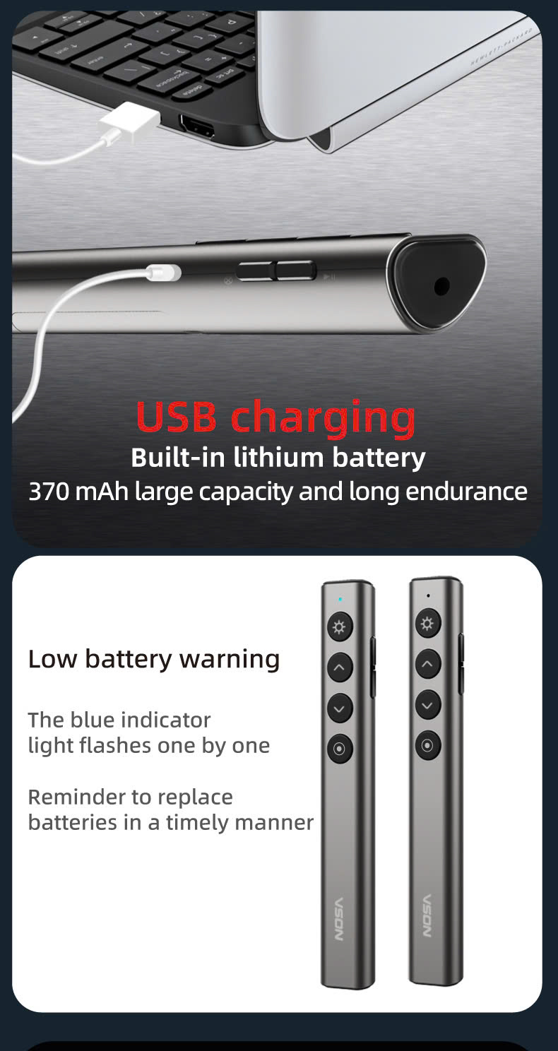 Bút Trình Chiếu kiêm Bút Cảm Ứng Laser VSON N52 (Kèm Pin Sạc USB-C) Mô tả sản phẩm: - Chức năng hỗ trợ: Hỗ trợ các thao tác trình chiếu như điều khiển lên/xuống trang,