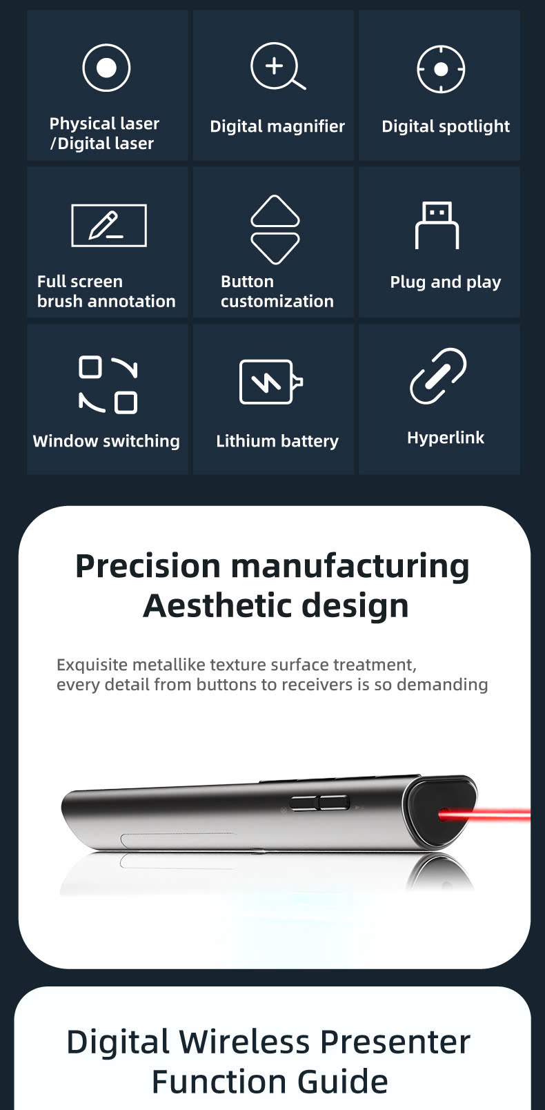 Thiết kế hiện đại, tích hợp nhiều chức năng hỗ trợ cho việc thuyết trình hiệu quả và chuyên nghiệp. Chức năng hỗ trợ: