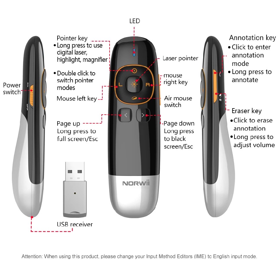 Bút trình chiếu Bluetooth dùng cho màn hình led Norwii N97S-G/R laser màu xanh/đỏ Video giới thiệu Bút trình chiếu Bluetooth dùng cho màn hình led Norwii N97S-G laser màu xanh Tính Năng Nổi Bật