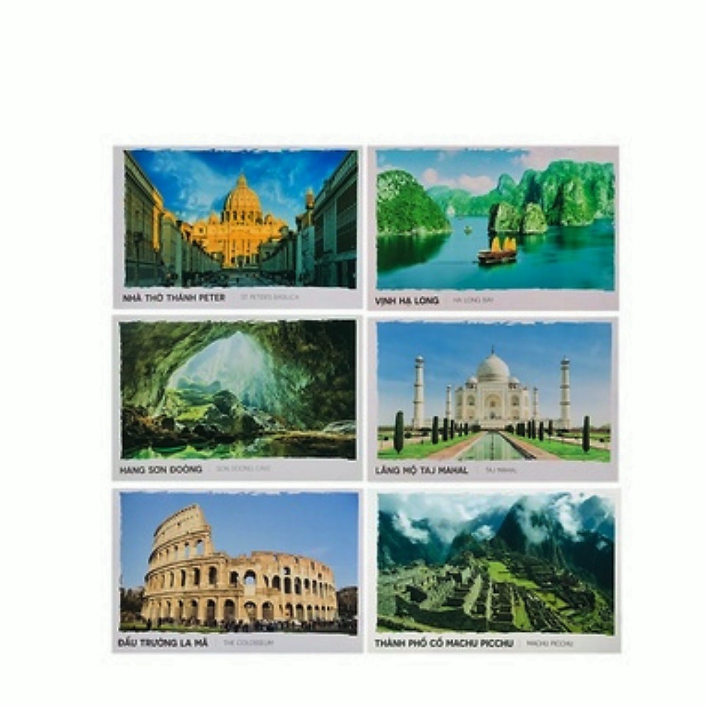 Bưu Thiếp Kỳ Quan Thế Giới MÔ TẢ Bộ poscard gồm 6 tấm ảnh về kỳ quan thế giới: - Thành Phố Cổ Machu Picchu - Hang Động Sơn Đoong - Lăng Mộ Taj Mahal